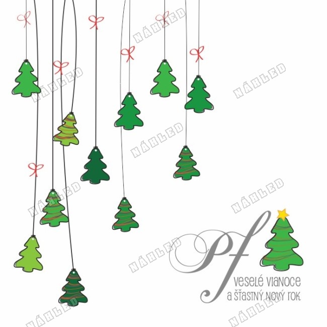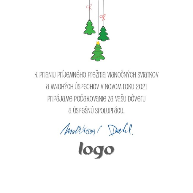 Bílé vánoční přání se zavěšenými zelenými stromečky