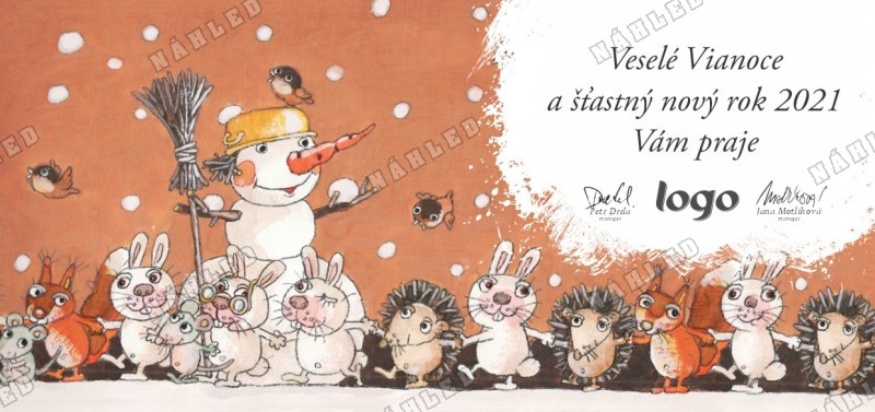 Vianočné želanie se sněhulákem obklopeným ježky, zajíčky, ptáčky a myškami.