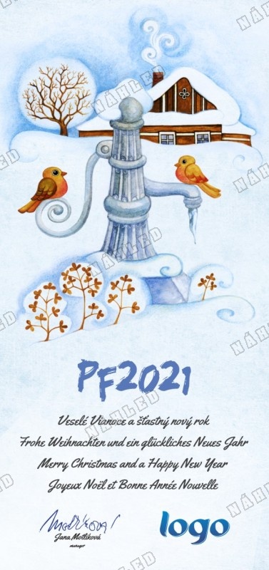 Novoroční přání se zasněženou chalupou a studnou s ptáčky
