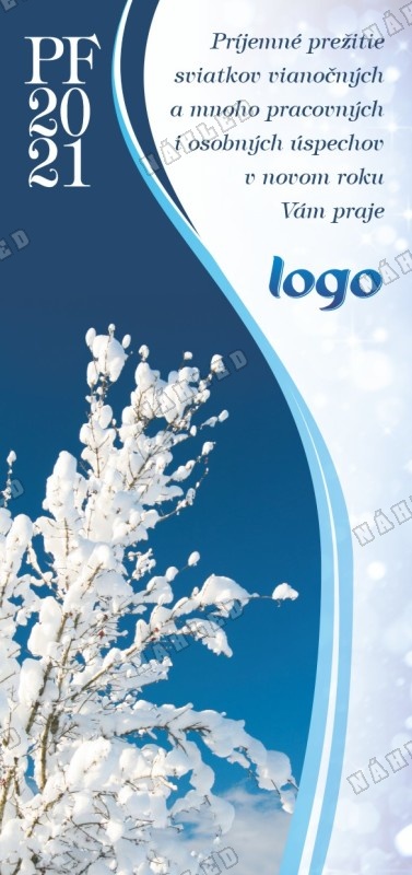 Modro bílé vánoční přání se zasněženým stromem
